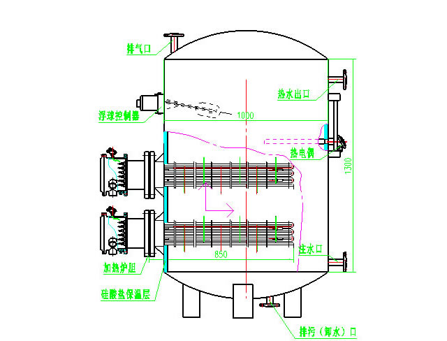 提高熱媒與被加熱水的流述,變層流換熱為紊流換熱。充分利用罐體內(nèi)初次加熱時冷、熱水之密度差,使其形成自然循環(huán)將罐體底部的冷水加熱。